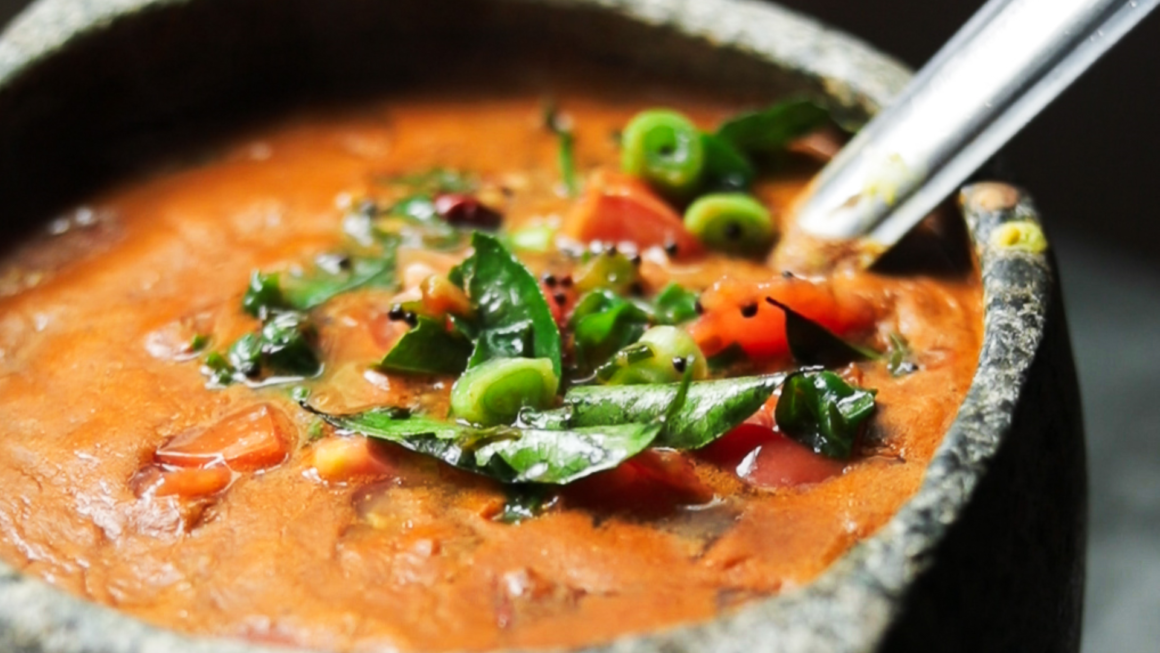 - In a separate pan, heat oil and add the mustard seeds, spring onions, tomato, and curry leaves. Allow them to splutter before pouring the tempering over the sambar.