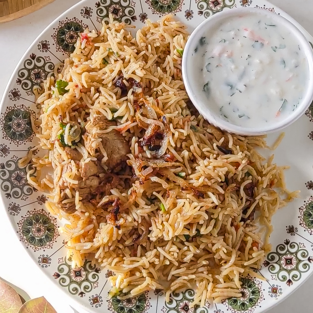 This easy, one-pot chicken pulao recipe can be made in under an hour and is perfect when paired with some refreshing cilantro raita.