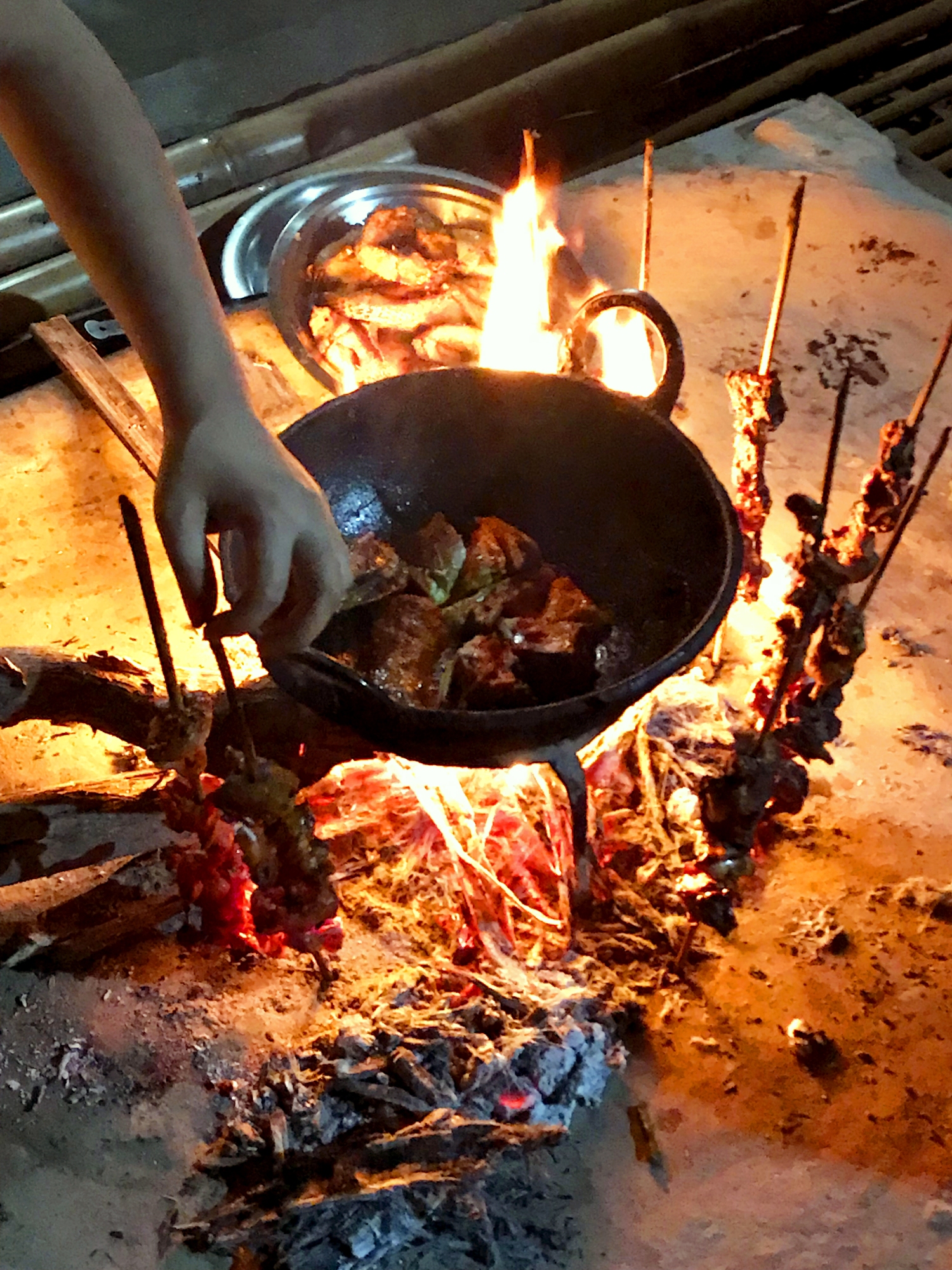The woody smoke had now enveloped the crackling skewered chicken and vessels of freshly steamed rice were unveiled as our brass dinner plates were being laid out. Peppered papads were fire-roasted for a crackling addition to the calm meal.