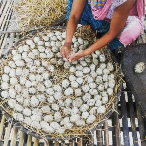 These are egg-shaped starter cakes prepared with rice powder and a carefully handpicked assortment of over twenty flavourful forest leaves, barks and herbs, including jackfruit leaf (kothal paat), wild pepper (bon jaluk), wild fern (biloghoni), sugarcane leaf (khuhiyar paat) and betel palm root (tambol).