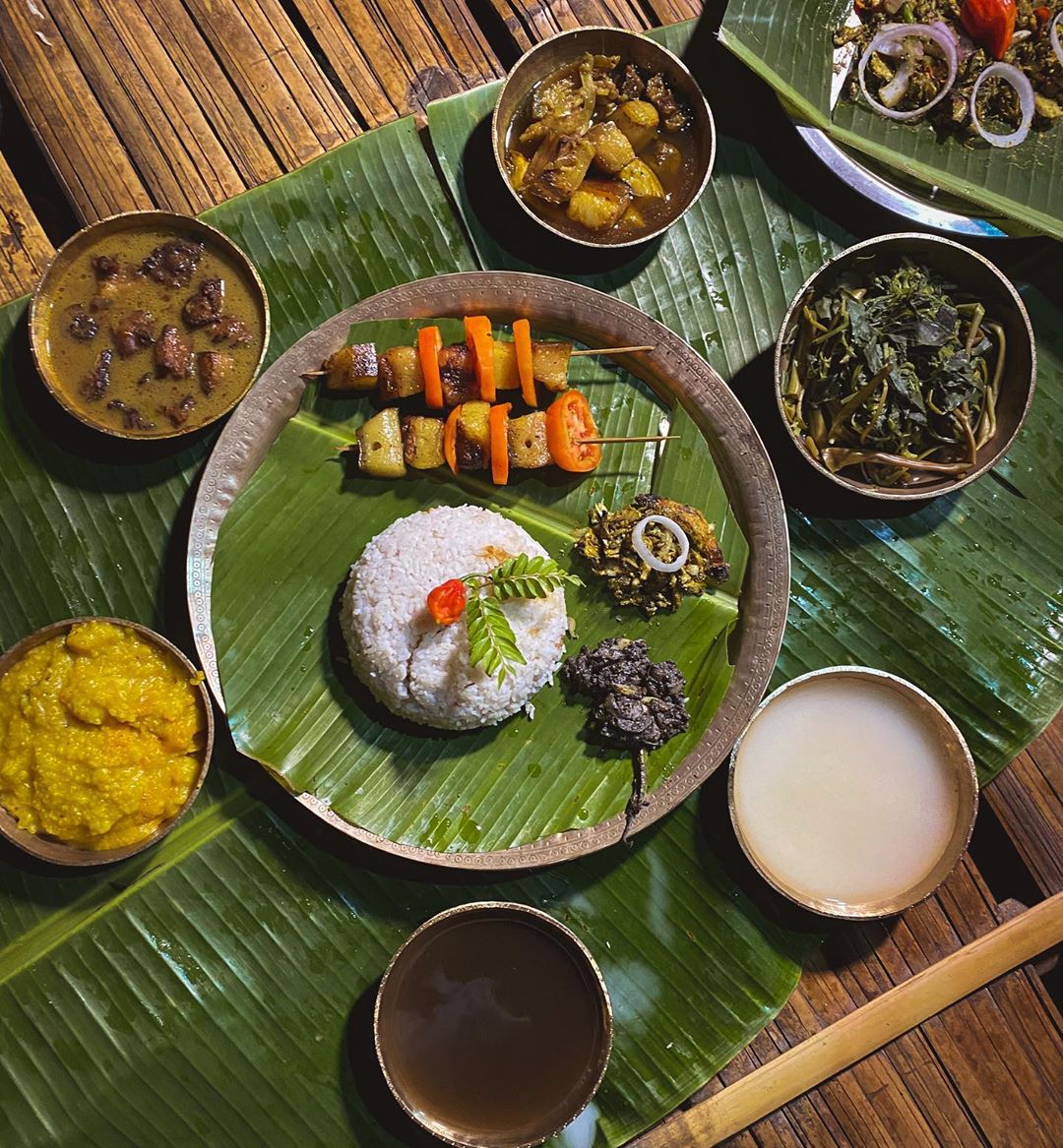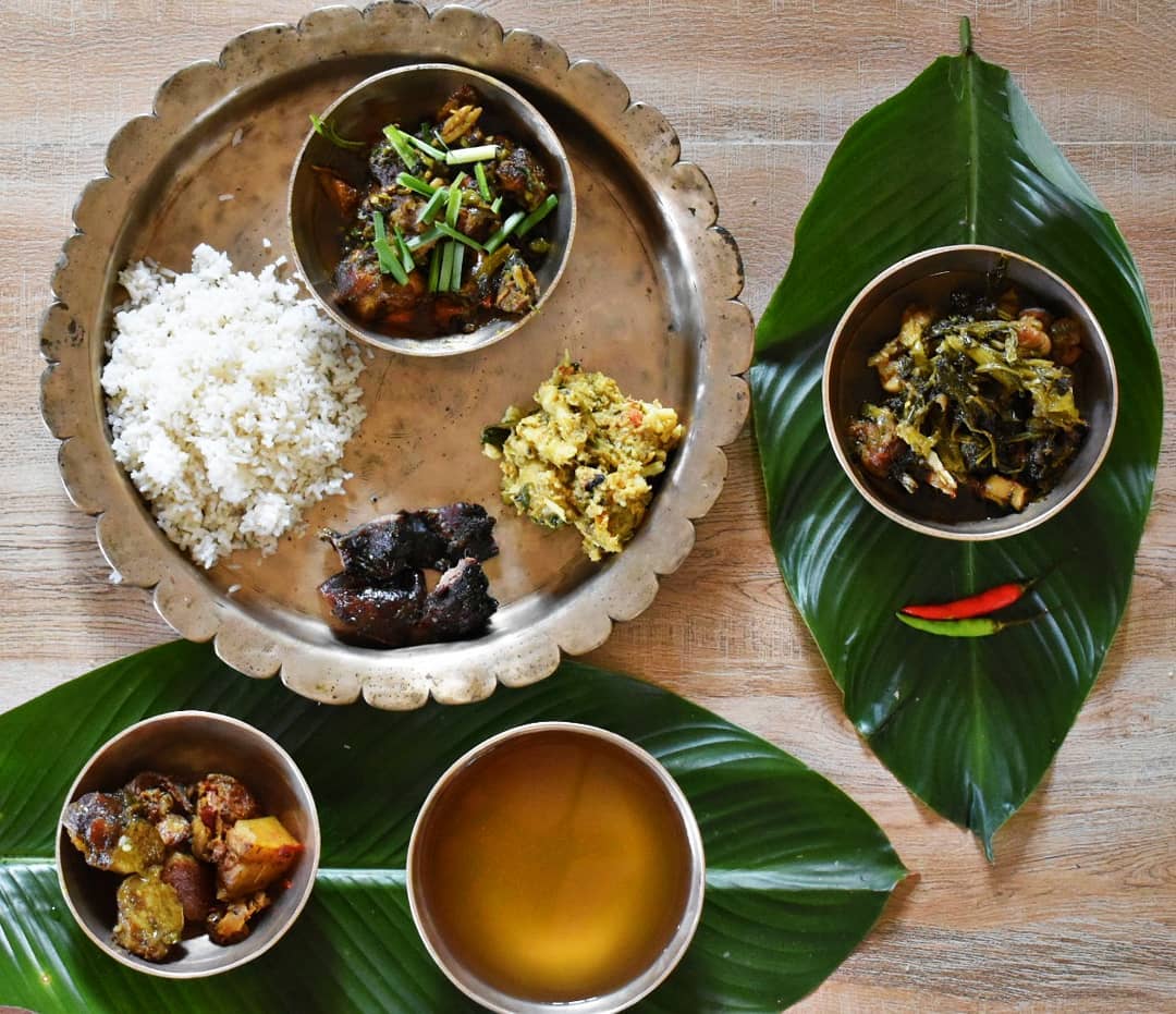 Suddenly, the aromas of slow-cooked food were unleashed, filling the room with a sense of snugness. Our plates were piled with fragrant bhat (rice), mosur dal (lentils) with a delicate tempering, mildly spiced horu aalu and leseri bhaaji (baby potato and yard long beans stir fry), some bengena bhaja (home style fried aubergines), bogori achar (jujube pickle) and papad; kukura khorika (chicken skewers) was added for the non-vegetarians. At the table, conversations softened as our curiosity drifted towards the thali (platter). The meal was therapeutic, pleasantly familiar and delicately spiced, with occasional bursts of bold flavours from jolokia (chilli peppers) and boga xoriyo (mustard seeds). It offered a comforting familiarity on an esoteric, outlandish settlement, reminding us of our inherent geocultural alikeness.