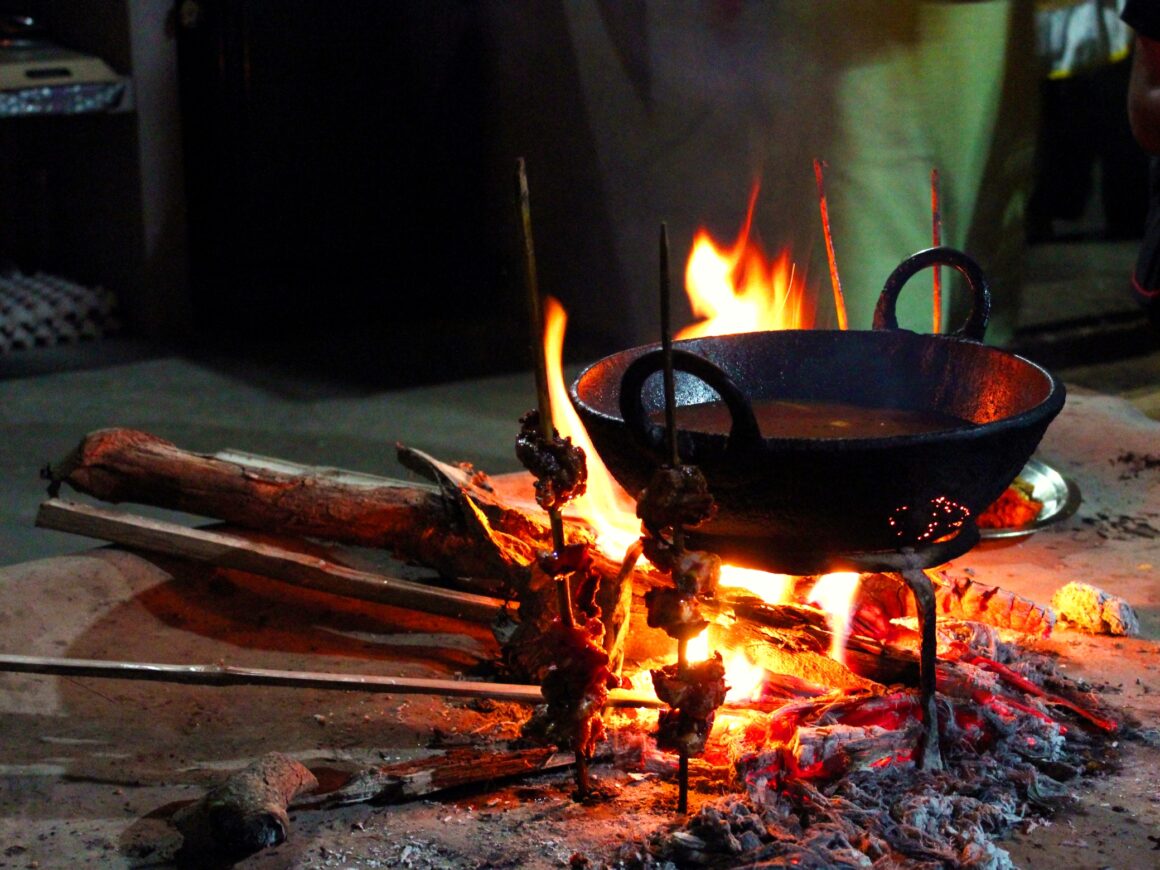 The woody smoke had now enveloped the crackling skewered chicken and vessels of freshly steamed rice were unveiled as our brass dinner plates were being laid out. Peppered papads were fire-roasted for a crackling addition to the calm meal.