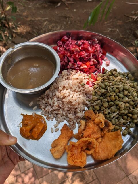 This dish represents what is at the heart of the work of The Traveling Thali, which is that we as humans are all dependent on each other for the food we eat and the way we live. It uses ingredients that originate in different parts of the world to create a simple and flavour-packed dish. I am also quite proud of how Mangalorean Konkani food fully uses all ingredients to the max to extract flavour and nutrition (in this case, the use of the pomegranate skin, and the garlic with skin on). This is a philosophy that is inherent to who I am and resonates in all our work at The Traveling Thali. And, of course, I love coconut and any dish with it will always have my heart.
