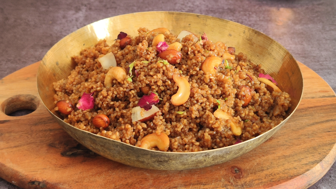 Lapsi is a traditional Rajasthani dessert made with broken wheat (dalia), jaggery, and ghee. It is a symbol of celebration in Rajasthan, often prepared during auspicious occasions, festivals, and weddings. The dish is deeply rooted in the culinary heritage of Rajasthan, reflecting the simplicity and richness of the region’s food culture. Known for its earthy flavours and wholesome ingredients, Lapsi is not just a treat for the taste buds but also a source of nourishment, offering a delightful blend of sweetness, aroma, and texture.