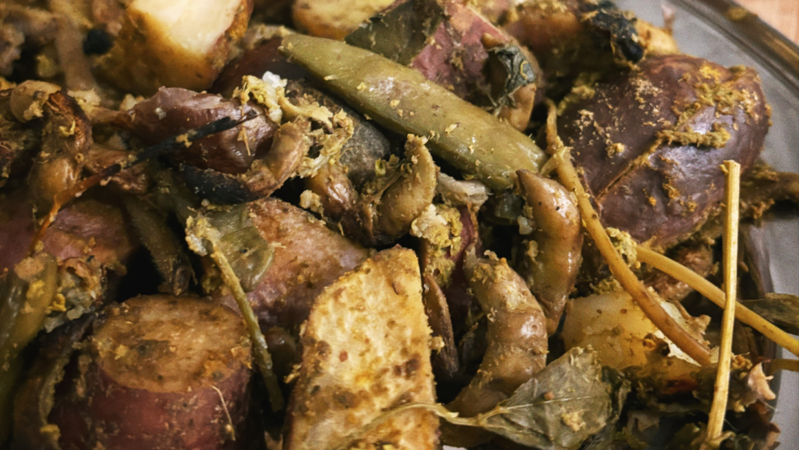 This, I’m beginning to understand, is how the dish works. Like most vernacular recipes, umbadiyu has been transmitted orally between generations of cooks, each adapting according to what grows in their particular patch, what they can forage, who they’re cooking for, what they like to eat. The dish resists codification; it slips instead between contexts, each time performing an act of translation. Tubers like yam, taro and sweet potato are indigenous to India, but potatoes would likely not have arrived in Gujarat until 1612, when the East India Company established warehouses in Surat to house imported foodstuffs. The recipe has evolved over centuries, absorbing new ingredients, shaped by migration, trade, Gujarat’s changing agro-climatic regions; the very pressures now threatening kalher vanaspati, which for so long has provided a resilient and reliable food source during low yields.
