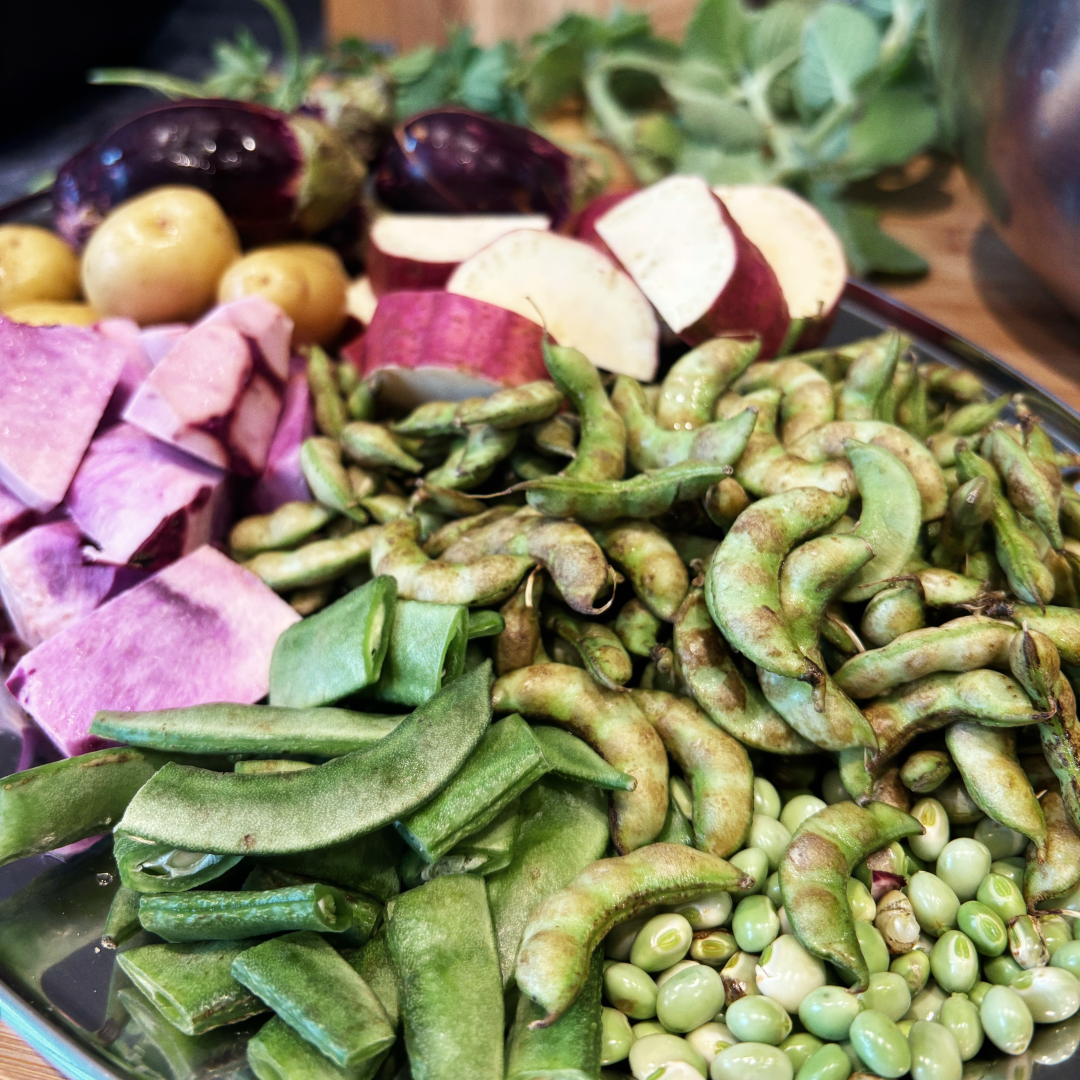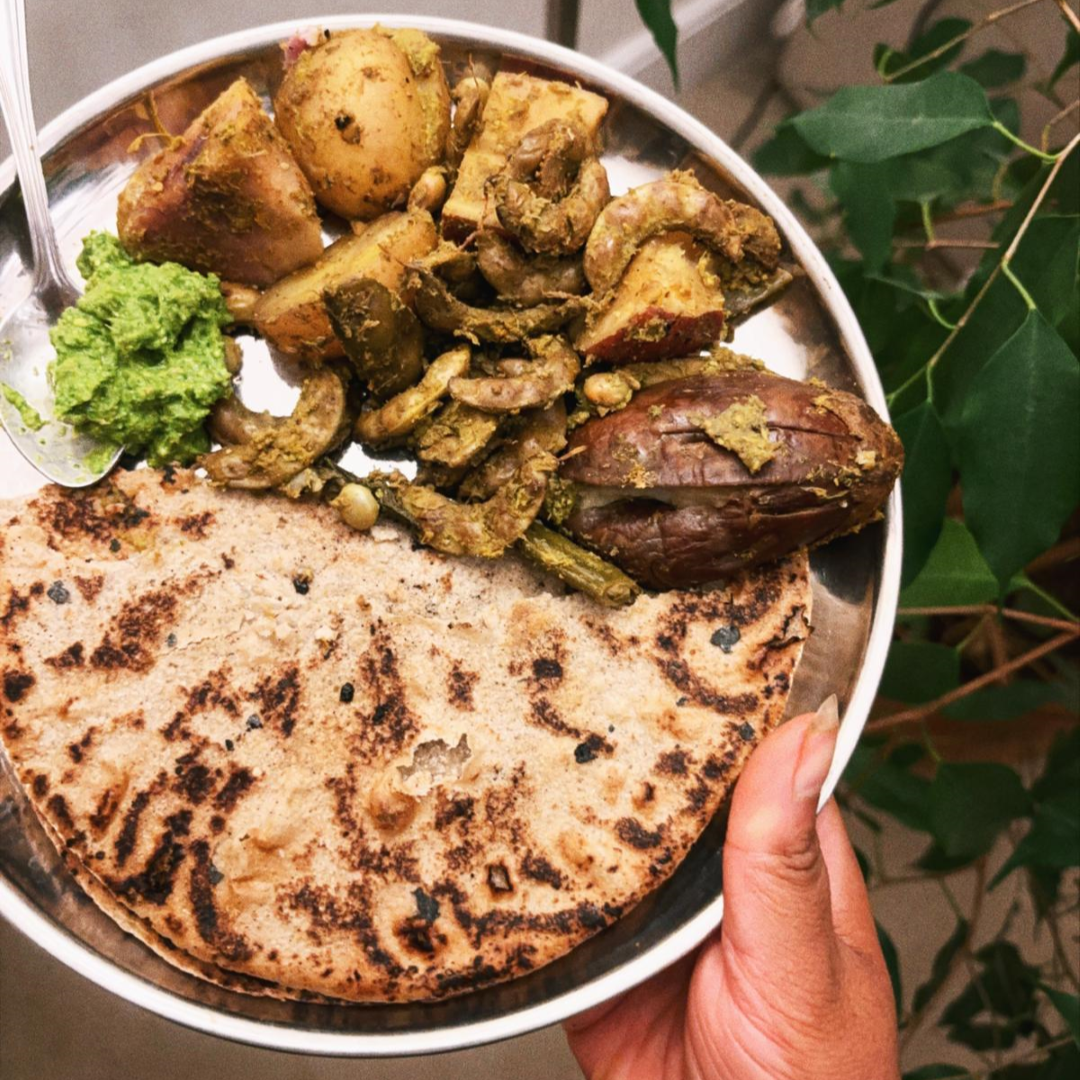 There is nothing noble or romantic about reinventing a recipe with all the wrong ingredients. I am not practising sustainability; how can I, when I inhabit a different ecology to the one umbadiyu is rooted in, thousands of miles away? But something has been transmitted across that distance. Not a recipe per se, but a way of paying attention. Kalher vanaspati are uncultivated crops, which is why they provide reliable nutrition during lean years, why they matter beyond their pungent contribution to flavour. They are the species that survive when other things fail, the grasses my ancestors knew to forage when those with land and status ate from granaries. Foodways that never made it into cookbooks, that were not codified by brahmin cooks or court kitchens, passed between generations who understood scarcity intimately.