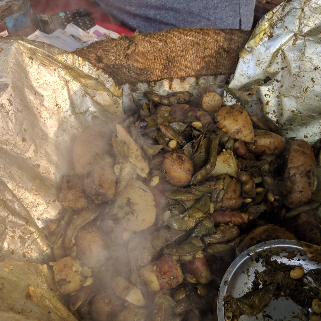 When I open the pot seal and lift out the reeds, my face is blasted with vapours instead of smoke, though the woodiness of smoked salt nearly convinces me otherwise. The vegetables are soft, lightly roasted, mostly-green instead of mostly-charred. Something between undhiyu and umbadiyu, perhaps, between the smokiness of the latter and the sweetness of the former. The bottom of the pot is burnt, which infuses the whole dish with an acridness, as if it has been cooked on the barbecue. At some point my husband pops his head around the door and, wrinkling his nose, gently asks if I’d like him to move the pot out to the garden, maybe? Next time, I’ll add a little water to the matla.